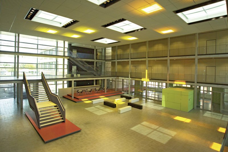 Von der Halle aus werden über transparente Erschließungsachsen die Klassenzimmer und Fachbereiche erschlossen. Die Wandoberflächen der Nebenflure sind in jedem Gebäudemodul in differenzierten Farben ausgebildet, um über die Farbgebung eine adäquate Orientierung für die Nutzer zu gewährleisten.