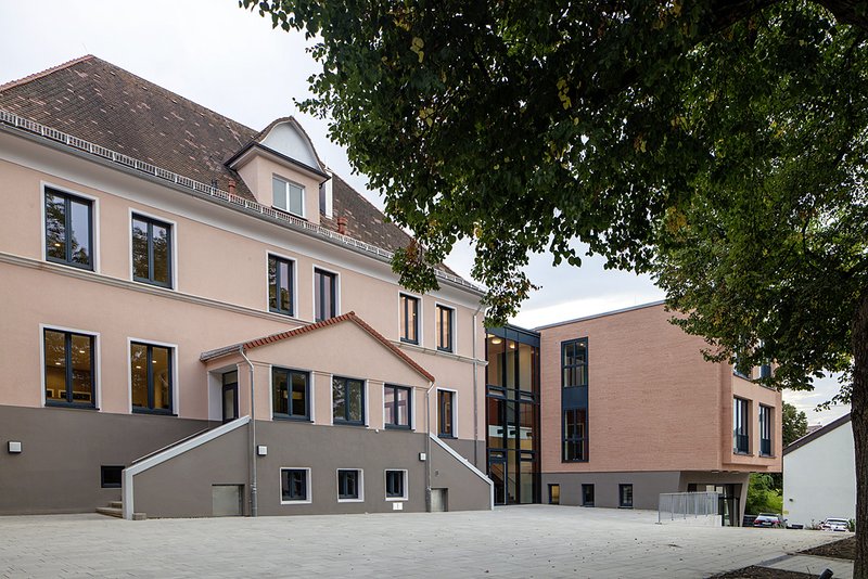 Die Freiraumgestaltung von Vorplatz, Schulhof, der öffentlichen Durchwegungen wie auch der südlichen Gartenanlage ist reduziert, zurückhaltend und nimmt bestehende Elemente wie die historische Schulhofabmauerung mit Treppenportikus auf. Auch die den Ort prägenden alten Linden konnten zum Glück weitgehend erhalten werden.