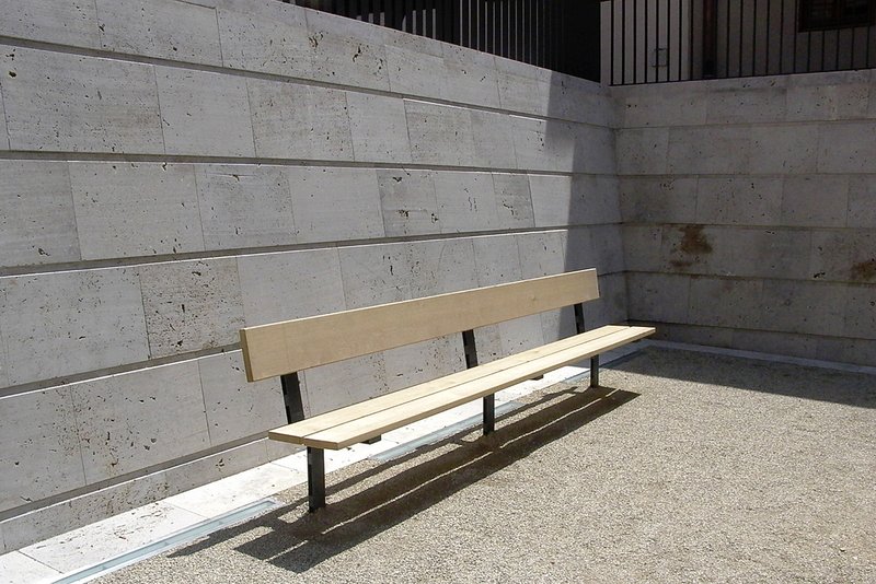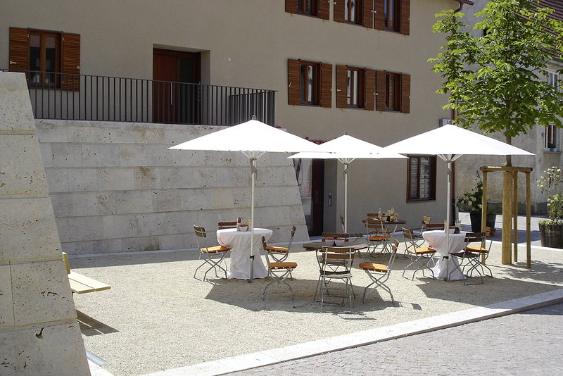 Eine Mauer aus heimischem Muschelkalkstein bildet eine neue Kontur innerhalb der Freifläche und vermittelt zusammen mit Treppenlinien die unterschiedlichen Ebenen. Teppiche aus Muschelkalkplattenbändern formulieren zu den Eingängen eine einladende Geste. Inmitten der Raumsituation entsteht eine Platzfläche, die von der Gastronomie als Biergarten im lichten Schatten einer Kastanie bedient wird. Pflanzgefäße aus Cortenstahl, Sitzbänke aus heimischer Eiche und eine dezente Beleuchtung in den Abendstunden illustrieren den aktuellen Zeitgeist ohne aufdringlich zu sein.