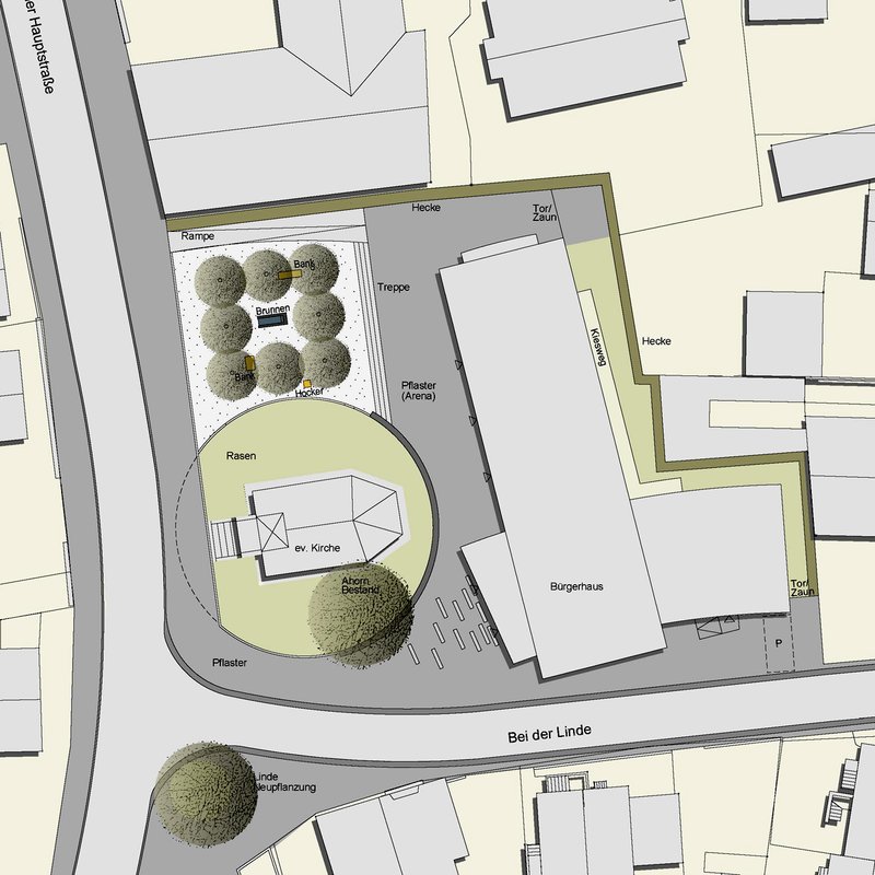 Eine Eibenhecke bildet den nördlichen Platzabschluss zur vorhanden Bebauung. Die acht Kugelrobinien formen ein Carrée mit Sitzmöglichkeiten am Brunnen. Sie bieten einen schattigen Platz im Sommer und werden zusammen mit dem Brunnen in den Abendstunden durch Bodenstrahler angeleuchtet. Die Kirche ist in eine Rasenfläche mit Bestandsbäumen eingebettet, die den ehemaligen Verlauf der Mauer um die Kirche aufnimmt.