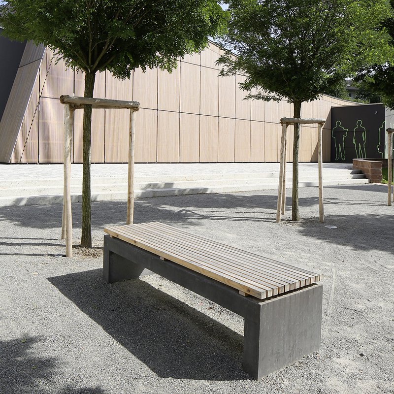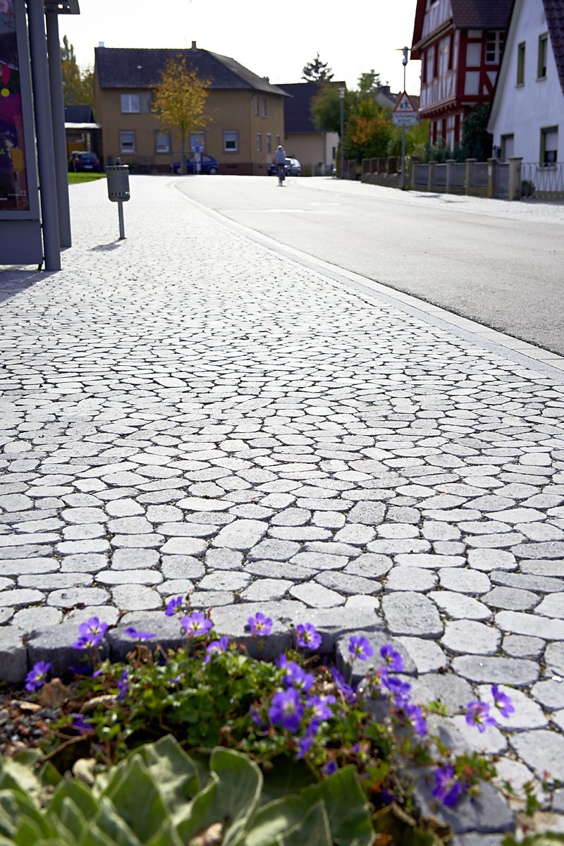 Das unregelmäßige grauschattierte Betonpflaster vermittelt zwischen der historischen Bausubstanz und der neuen Holzfassade des Bürgerhauses. Eine wassergebundene Decke im zentralen Platzbereich unterstreicht den dörflichen Charakter und sorgt gleichzeitig für eine optimale Regenwasserversickerung. Der beleuchtete Brunnen, die Bänke und die lang gezogene Rampe in bearbeitetem bzw. dunkel durchgefärbtem Beton setzen Akzente in einer zeitgemäßen Architektursprache.