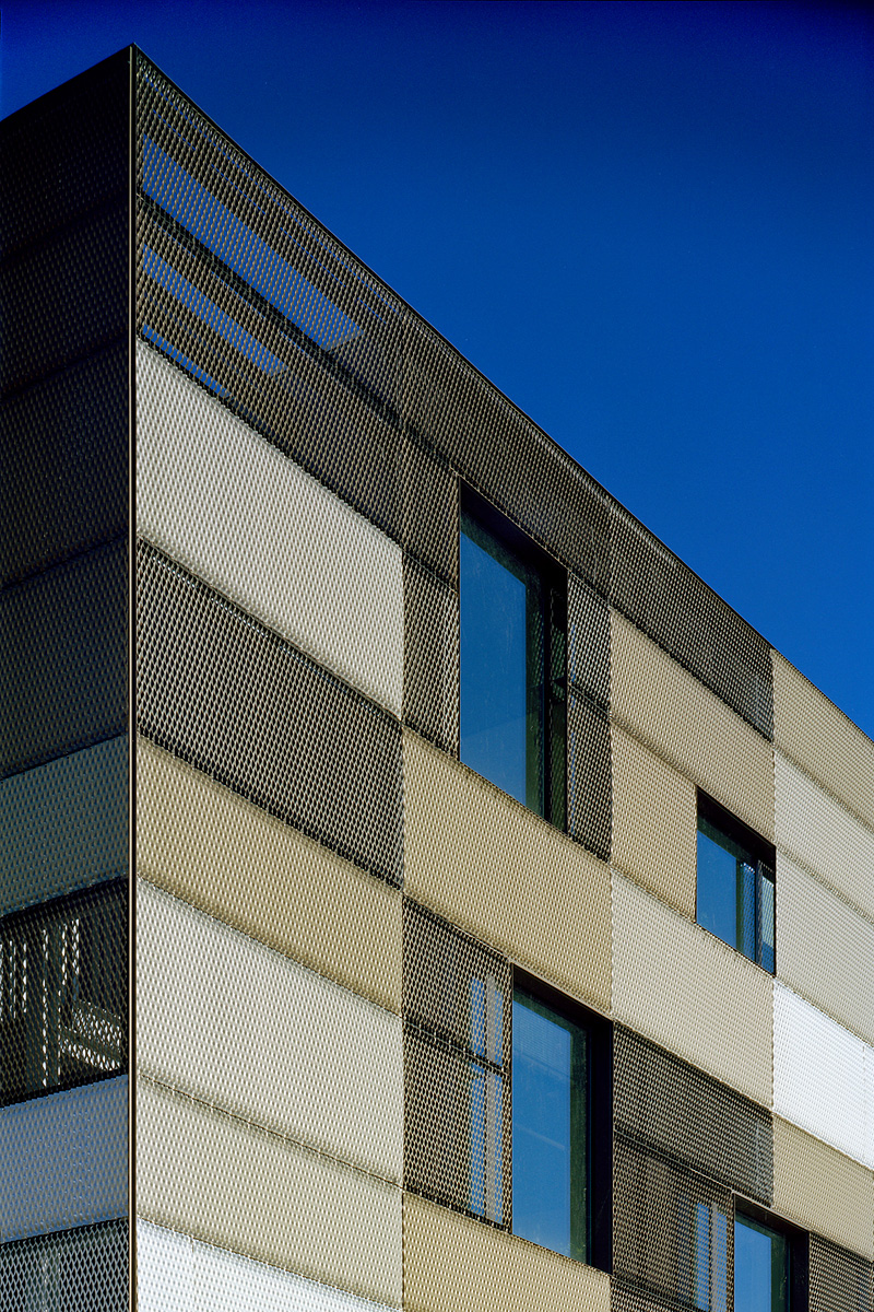 Die vorgehängte, hinterlüftete Fassadenverkleidung besteht aus eloxiertem Aluminium-Streckmetall. Entgegen der üblichen Verlegeweise ist es jedoch um 90 Grad gedreht eingebaut. Dadurch variieren Reflexionsgrad und Lochanteil je nach Standpunkt des Betrachters, was insbesondere im Vorbeifahren zu einer sich ständig verändernden Ansicht und Farbigkeit führt. Aus den lediglich drei verwendeten Eloxaltönen entsteht so ein Vielfaches an fein abgestuften Farbnuancen. Der verwendete Farbraum zitiert die umgebenden ortstypischen Speicherbauten der Hafenstraße, während die graphische Verteilung der hellen und dunklen Bleche aus einer digital abstrahierten Portraitfotografie John Lennons generiert wurde. Das ‘schillernde’ Erscheinungsbild setzt sich im Inneren fort. Hier kommen neben Sichtbeton hochglänzende Materialien wie polierter Edelstahl oder Lack zum Einsatz.