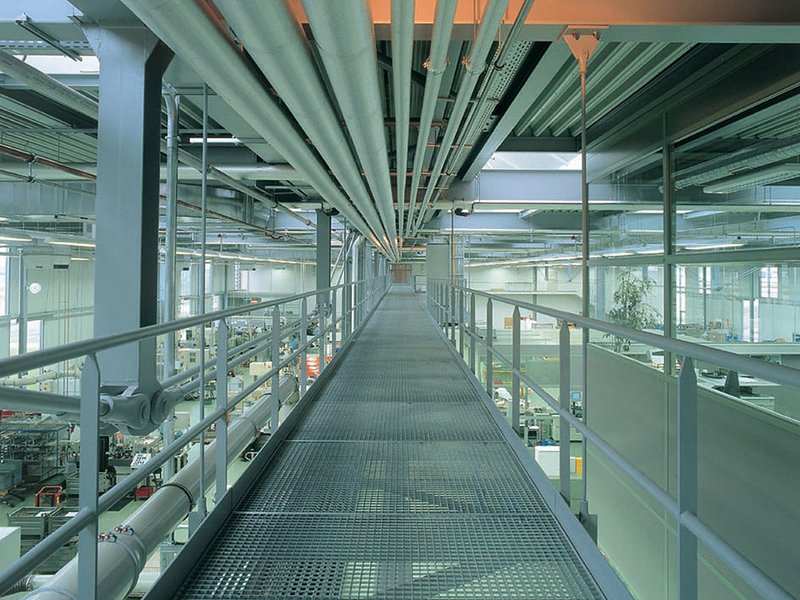 Um den Elektrosmog an den Arbeitsplätzen zu minimieren, steht die Trafoanlage im Untergeschoss unter dem Entsorgungsgebäude. Um keine Unterschiede zwischen Verwaltungs- und Produktionsmitarbeiter entstehen zu lassen, wurde die Fassade der Verwaltung gleichbehandelt wie die Produktionsfassade. Durch die Verteilung von geschlossenen und verglasten Flächen entstanden helle sympathische Arbeitsplätze.