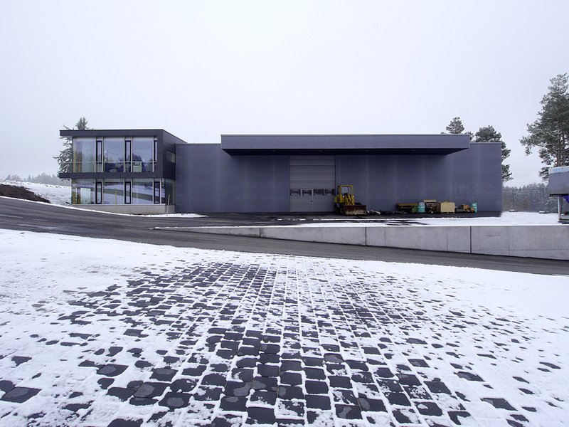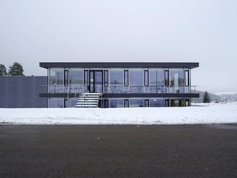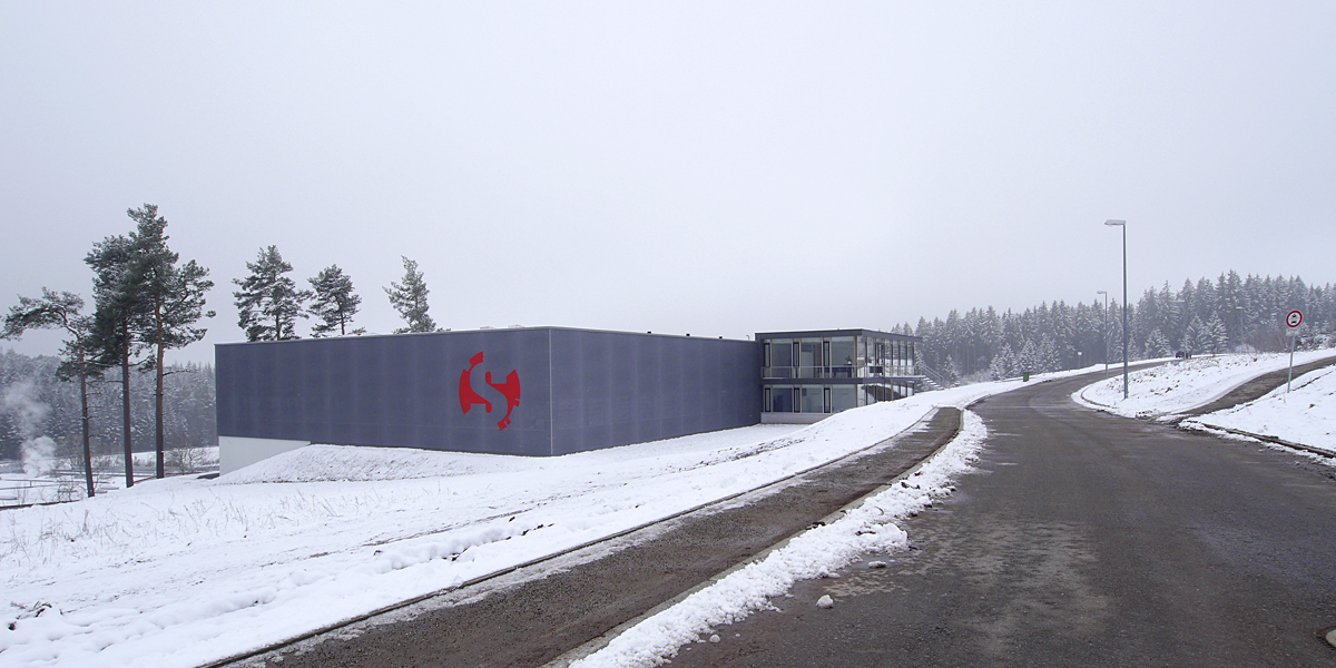 Das Gebäude befindet sich im zweiten Bauabschnitt des Gewerbegebietes "Hagenmoos" in St. Georgen im Schwarzwald. Der Bauherr, eine Werkzeugbaufirma, die sich auf Sonderteileproduktion spezialisiert hat, wünschte sich eine großzügige neue Produktionshalle mit den dazu gehörenden Nebenräumen sowie einen neuen Bürobereich mit größeren Besprechungsmöglichkeiten. Das Grundstück weist für eine Produktionsstätte mit linearem und horizontalem Produktionsablauf eine eher ungünstige Topographie auf: Es hat ein Gefälle von der Erschließungsstraße bis zur unteren Grundstücksgrenze von ca. 5 Metern. Aus dieser Schwierigkeit heraus ist der Entwurfsansatz entstanden. Der erste – untere - Höhenausgleich im Gelände wird mit einem längs zum Hang ausgerichteten Funktionsgeschoss (Ebene -1) für die Produktion genutzt, das gleichzeitig den Sockel für das Gesamtgebäude bildet. Die Ebene 0 ist die Ebene der Produktionshalle und gleichzeitig das Untergeschoss des Verwaltungsbaukörpers. Die Anlieferung an die Halle erfolgt seitlich über einen Betriebshof, der durch eine Rampe an die Straße angeschlossen ist. Der zweite Höhenausgleich wird mit dem zweigeschossigen Bürotrakt erzielt, dessen obere Ebene (Ebene +1) - etwas erhöht zum Straßenniveau - die Zugangsebene bildet. Mit dieser Entwurfsidee wurde zum einen auf die Topographie eingegangen, andererseits aber auch die unterschiedlichen Funktionen wie Büro-, Produktions- und Nebenräume sauber voneinander getrennt. Die Mitarbeiter genießen ihren Arbeitsplatz mit dem tollen Blick in die Schwarzwälder Landschaft und gleichzeitig sieht jeder Besucher bzw. Kunde das auf der Anhöhe stehende Gebäude schon bei der Abbiegung von der Landstraße ins Gewerbegebiet.