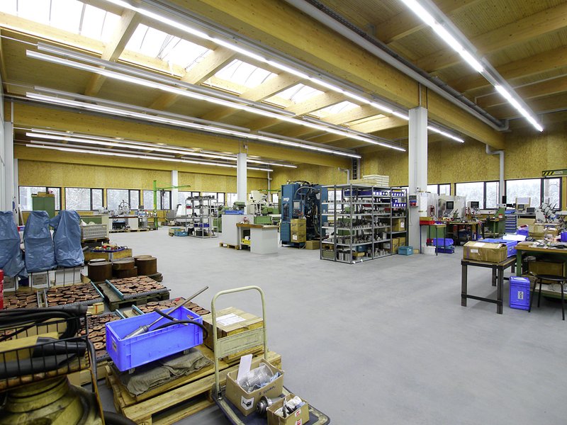 Die Produktionshalle hat ein primäres Tragraster von 10 x 10 Metern. Im Innenbereich der Halle stehen hier Stahlbetonstützen (40 x 40 cm²) – in der Außenwand KVH-Pfosten. Diese tragen die Hauptleimholzbinder (104 cm hoch), auf denen die Nebenträger (48-60 cm im Gefälle) liegen. Die Deckenuntersicht besteht zugunsten der Akustik aus einer geschlitzten Fichtenholzplatte als fertige Oberfläche. In der Decke ist in den vier Feldern des Haupttragwerkes jeweils eine Lichtstraße eingebaut. Die Nebenträger laufen unter der Lichtstraße durch ohne ausgewechselt zu werden.