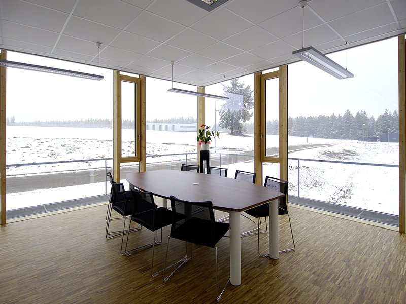 Die Trennwand zwischen Produktion und Verwaltung ist als doppelschalige Wand aus KVH-Ständern ausgeführt mit F-90 Anforderung. Die sichtbare Oberfläche in der Verwaltung ist eine gespachtelte und weiß gestrichene Gipsfaserplatte. Beheizt wird das Gebäude durch eine Gasbrennwertheizung. Zusätzlich wird die Kompressorabwärme über eine Wärmerückgewinnung genutzt. Im Verwaltungsgebäude ist eine Fußbodenheizung eingebaut. In der Produktionshalle sind an der Decke Radiatoren ("Klix") montiert, an die gleichzeitig die Beleuchtung integriert ist. Außerdem wurde im Technikraum ein späteres Nachrüsten eines Blockheizkraftwerks eingeplant.