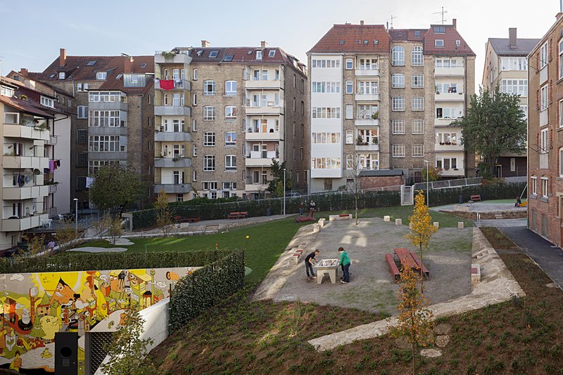 Die Gestaltung der Freifläche ermöglicht durch ihre Offenheit sowohl Einblicke von der umliegenden Bebauung (soziale Kontrolle, Blick ins Grüne), als auch Räume, in die man sich zurückziehen kann. Die durch die hohe Bebauung reduzierte Besonnung wird durch die Gestaltung maximal ausgenutzt.