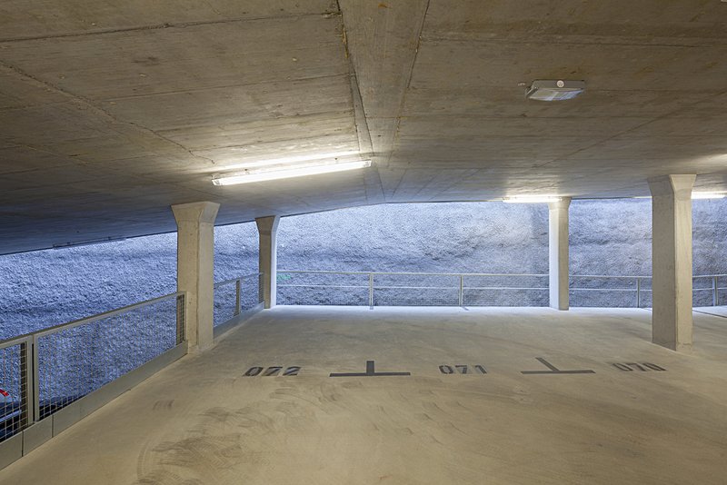 Das räumlich gefaltete Dach der Tiefgarage zeichnet die vorhandene Topographie des Areals nach und schafft ein überraschendes Raumerlebnis. An ihrem Rand fällt durch einen Lichtschlitz Streiflicht tief in die Untergeschosse. Angelehnt an die Schollen-Struktur des Daches wurden mit Geländekeilen terrassierte Flächen geschaffen, die eine gute Nutzbarkeit ermöglichen.