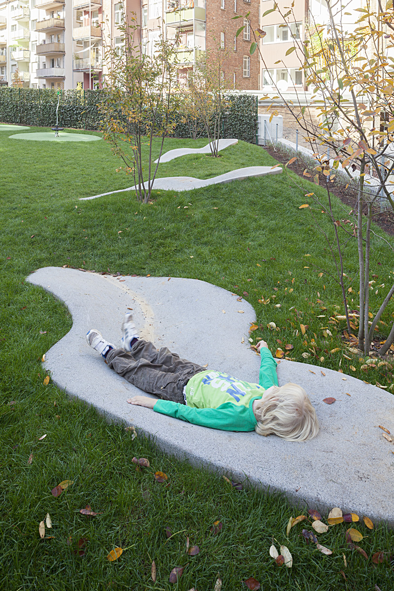 - Die Rasenterrasse mit Felsenbirnenhain und den Liegemulden bilden das grüne Zentrum aus. Spielgräser ergänzen das Bewegungsangebot auf der Rasenfläche für etwas größere Kinder.