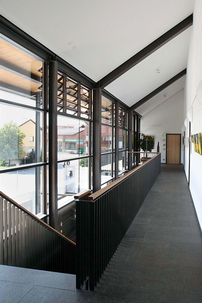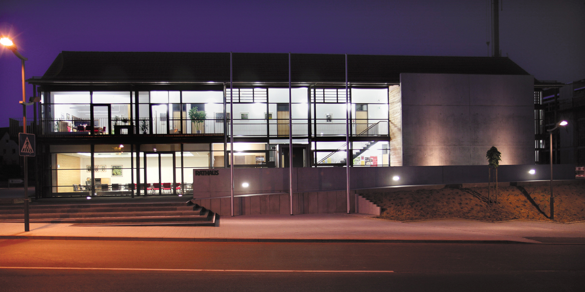 Hülle und Volumen sind entwickelt aus dem ortsüblichen Bauernhaustypus des Langhauses. Während die Straßenräume des Ortes geprägt sind von introvertierten, allseitig umschlossenen Volumina der kargen Bauernhäuser der Ostalb, gibt das neue Rathaus den "öffentlichen Teil" seines Innenlebens preis. Die zum Dorfplatz hin orientierte Halle mit "Narrenkanzlei" und inneren Erschließungswegen wird durch die transparente Glasfassade Teil des öffentlichen Raumes. In gleichem Maße wird das Leben auf dem Platz und die ortsprägende Pfarrkirche im Innenraum des Rathauses präsent.