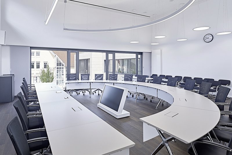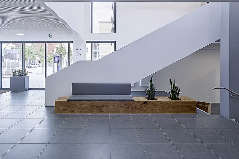 Der Sitzungssaal orientiert sich durch die großzügige bodentiefe Verglasung zum neu gestalteten Rathausplatz. Ein zusätzliches Oberlichtband garantiert eine optimale Belichtung und verleiht dem Innenraum eine helle und freundliche Atmosphäre. Durch die Split-Level-Ebenen entsprach das bestehende Rathaus nicht mehr den Anforderungen eines öffentlichen, barrierefreien Gebäudes. Der nachträglich eingebaute Aufzug überwindet alle Höhenversätze und ermöglicht eine barrierefreie Erreichbarkeit aller Gebäudeteile. Der vom Parkplatz aus stark frequentierte Nebeneingang wurde verbreitert und bildet mit dem Foyer eine klare Erschließungsachse, in die Treppe und Aufzug integriert sind. Neben der Orientierung für Besucher wurden Licht- und Wegeführung innerhalb des Gebäudes verbessert.