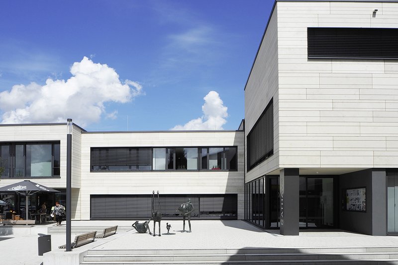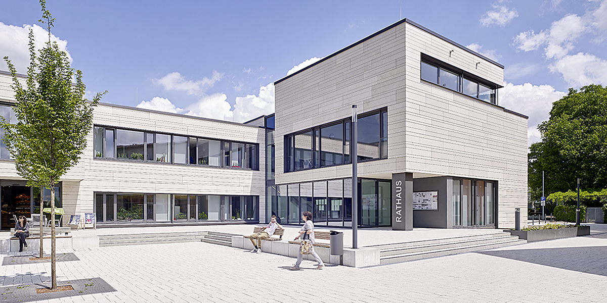 Außenanlagen und Rathausplatz wurden ebenfalls neu geordnet. Durch die Aufschüttung der bestehenden Tiefhöfe und dem Abriss der Außentreppe ins Untergeschoss wurde die bisher schmale Fußgängerpassage zur Stadtbücherei aufgewertet und deutlich verbreitert. Ein klar definierter, von Sitzbänken eingefasster Platz schiebt sich in die leicht ansteigende Topografie. Unter dem schattenspendenden Baumdach konnten die Außenbereiche der Gastronomiebetriebe erweitert werden, so dass eine neue, kommunikative und lebendige Ortsmitte entstanden ist.