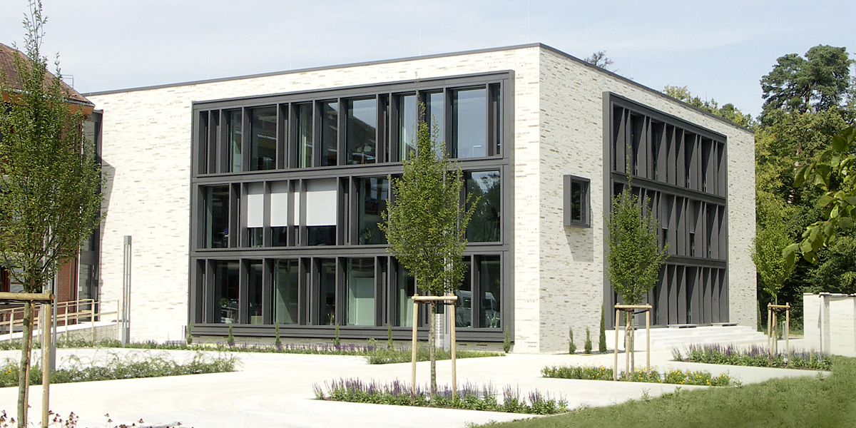 Die Höhe des Baukörpers nimmt die Traufe des Bestandes auf. Gleichsam bezieht sich die Gliederung der Fassade auf den Bestand. Es erfolgt jedoch in der Summe der gestalterischen Details eine unmissverständliche Interpretation im Sinne des Jahres 2012. Die Materialien und die Farbwahl signalisieren Eigenständigkeit. Trotz moderner vertikaler Lamellenkonstruktion bleibt eine subtile Zusammengehörigkeit mit dem Altbau gegeben.