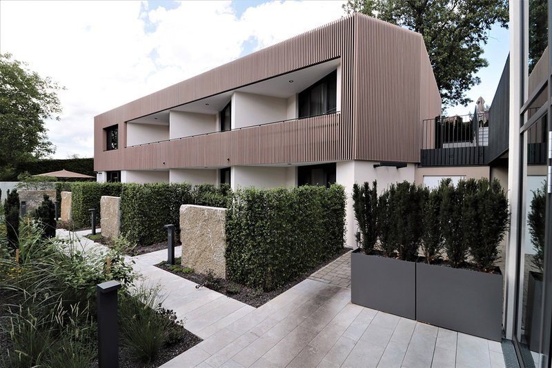 Der direkte Zugang zu den Zimmern im Erdgeschoss erfolgt über den begrünten Innenhof und eine kleine, durch Bepflanzung und Muschelkalkscheiben geschützte Terrasse.