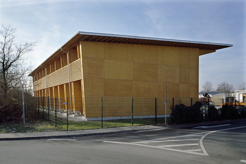 Die Abmessungen der Halle L/B/H 31.50/ 13.50/ 7.50 m i.M. ergeben sich durch die geforderte Lagermenge des Salzes, der maximalen Schütthöhe von vier Metern und der Kipphöhe der in der Automeisterei vorhandenen Radlader. Der Innenraum ist stützenfrei. Die einschaligen Wände sind beidseitig mit kesseldruckimprägniertem Furnierschichtholz, den waagerecht verlegten großformatigen 27 mm starken Kerto-Q-Platten beplankt. Die hohen Schubkräfte durch das vier Meter hoch lagernde Salz werden im Verbund von Tragwerk und der Beplankung von Außenwand und Dach aufgenommen.