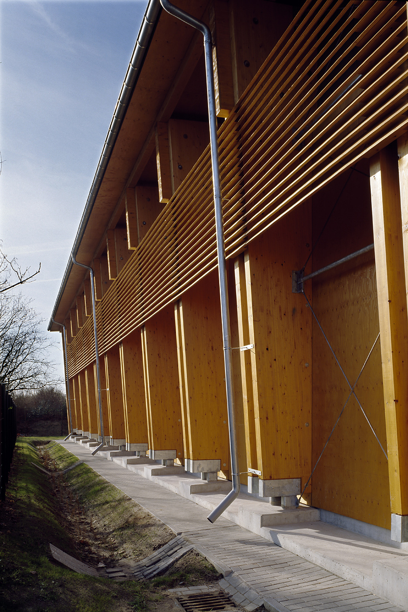 Tragwerk: Halbrahmen aus Brettschichtbindern als Zangenkonstruktion, Dachriegel und Pendelstütze aus Konstruktionsvollholz. Giebelwände als eingespannte 7,50 m hohe Stahlstützen im Abstand von 2,65 m.