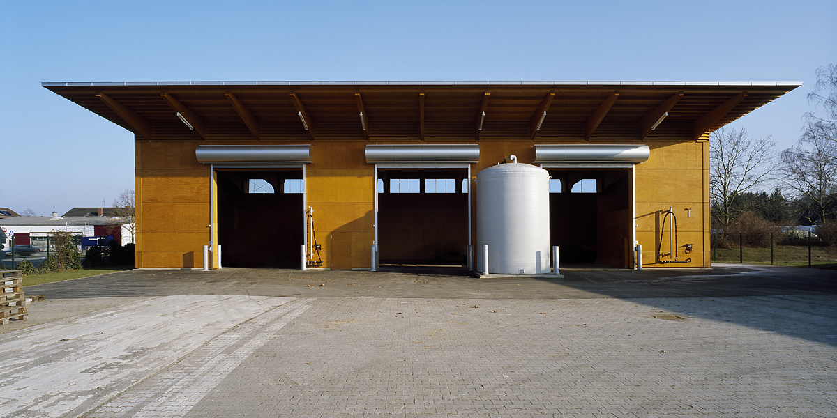 Der Hallenneubau wird von der Längsseite über drei Tore angedient. Die Befüllung der Streugutfahrzeuge mit der fertigen Sole erfolgt im Vorbereich über den Soletank mittels zwei Schlauchanlagen. Der Dachüberstand wirkt als konstruktiver Holzschutz und schützt den freistehenden Soletank, in dem die gebrauchsfertige Sole bevorratet wird.