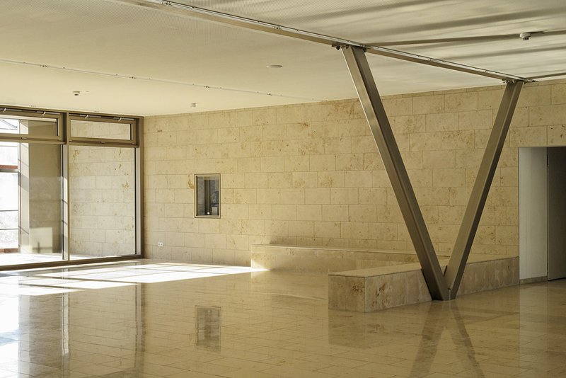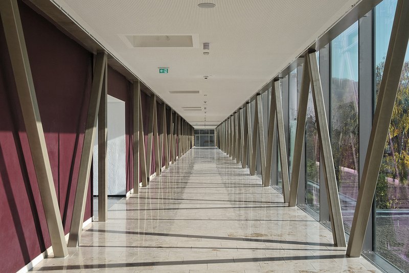 Der massive statische Eingriff ist selbst Thema der Fassadengestaltung. Der aussteifende zweigeschossige Fachwerkträger wird wie in einem riesigen Schaufenster nach Süden hin "ausgestellt". Die Kraftableitung aus dem horizontalen Träger in die Erde wird bis nach außen hin sichtbar gemacht.