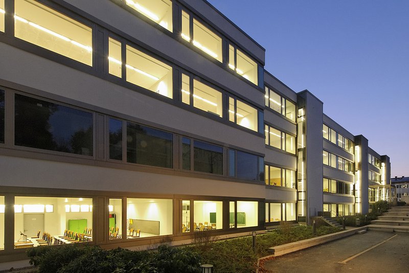 In 2009 erhielten wir den Auftrag, bei der Theodor-Heuss-Realschule, einem Sichtbetongebäude von 1965, die energetische Sanierung der Gebäudehülle zu planen. Gleichzeitig sollte ein neuer Schuleingang auf der bisher geschlossenen Rückseite des Gebäudes geschaffen werden, um den Anschluss an das dahinter liegende Quartier mit dem Schul-Campus herzustellen. Bereits die ersten Untersuchungen der Gebäudehülle zeigten, dass aufgrund der besonderen Gebäudestruktur eine sinnvolle Sanierung nicht ohne Eingriffe in die Gebäudesubstanz möglich sein würde.