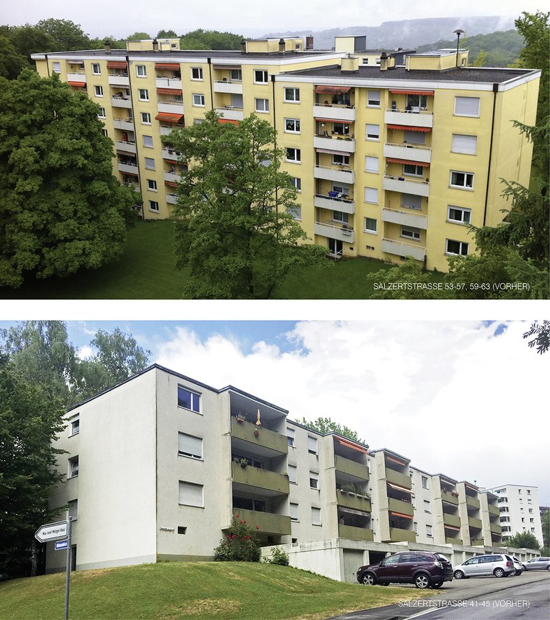 Bei den Wohnbauten Salzertstraße 41-45 entstanden, durch die tiefen, nistkastenartigen Balkonelemente, zur Straße hin geschützte und dennoch lichtdurchflutete Aufenthaltsräume im Freien. Den neuen Zugängen in die einzelnen Gebäude wurde besondere Aufmerksamkeit beigemessen. Aus in die Jahre gekommenen, recht dunklen Eingängen wurden großzügige, wettergeschützte „Adressen", die zur nachbarschaftlichen Kommunikation einladen.