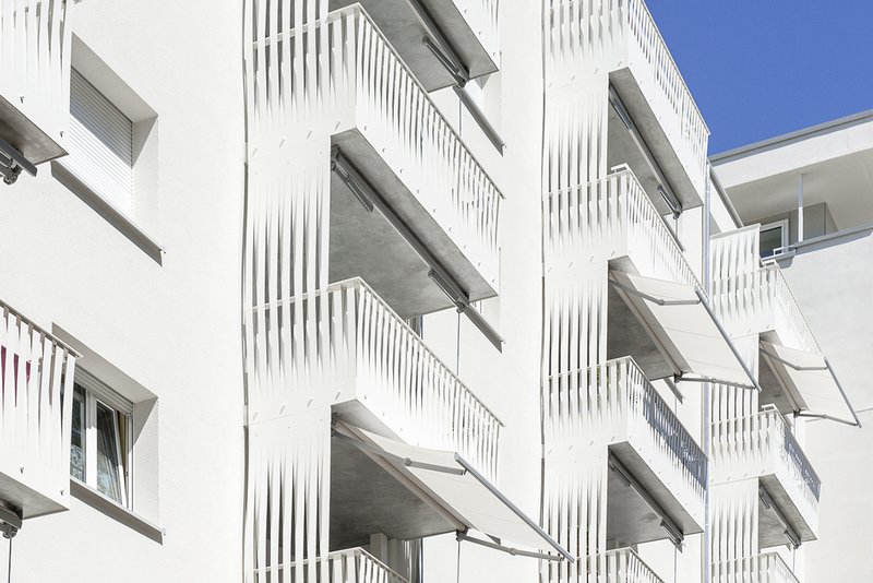 Bei der Sanierung der Gebäudehüllen und der Erneuerung der Balkone wurde großer Wert darauf gelegt, die architektonischen Qualitäten des Bestands herauszuarbeiten und mit sensiblen Eingriffen zu stärken. In diesem Sinne wurden die Balkone mit einem feinen Metallgeflecht eingekleidet, das mit Licht- und Schattenspielen das Verweilen im Freibereich bereichert.