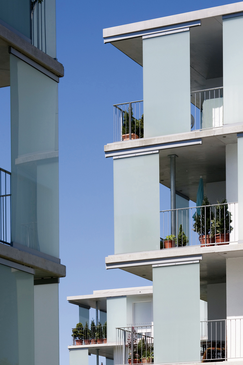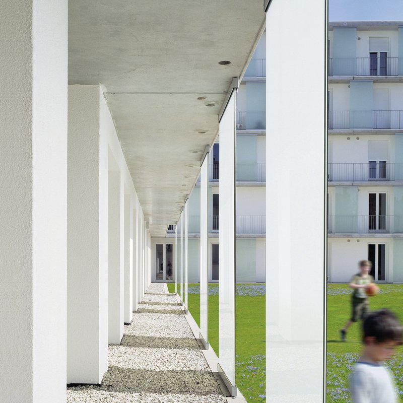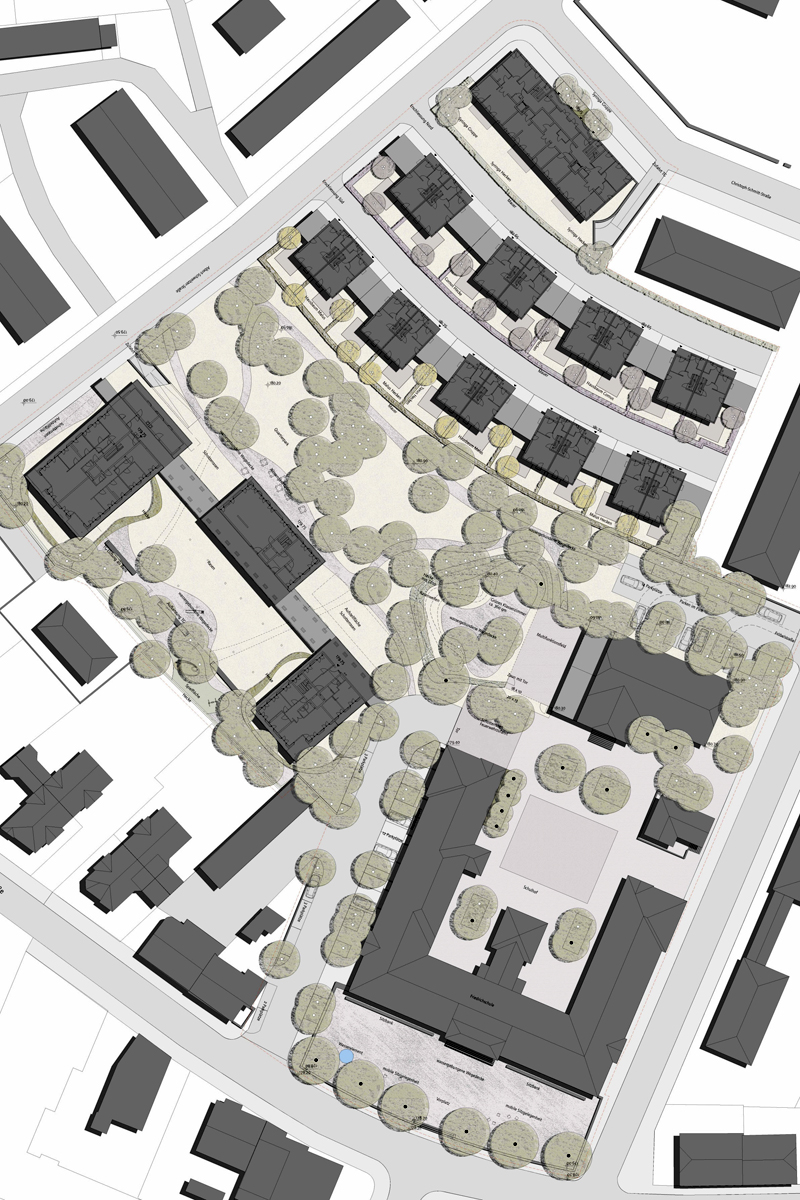 Das städtebauliche Konzept, resultierend aus einem Wettbewerb vom Juli 2006, sah nach Abbruch der Wohngebäude und Garagenzeilen unter dem Leitgedanken "Wohnen in allen Lebensphasen" drei fünfgeschossige Punkthäuser im Süden und Doppelhäuser im Norden vor. Wettbewerbsgewinner waren die Architekten Baumschlager-Eberle aus St. Gallen. Außergewöhnliches Entwurfsmerkmal ist der neu geschaffene, öffentliche Park mit integrierter Multifunktionsfläche, dem Kernstück des Areals. Große Einzelbäume, Ruhezonen und ein Spielangebot für Kinder und Jugendliche bieten die Möglichkeit für ein lebendiges Miteinander. Die Multifunktionsfläche für Fußball-, Handball- oder Basketballspiele sowie ein Grünes Klassenzimmer ermöglicht der Schule, den Bewohnern und auch der Öffentlichkeit unterschiedlichste Aktivitäten. Das Landschaftsplanungsbüro Vogt aus Zürich erstellte hierzu die Planung.
