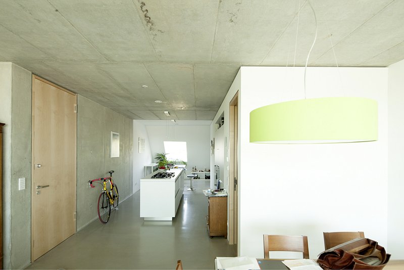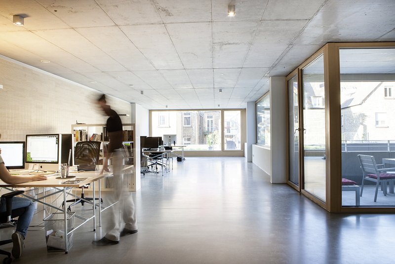 Das ganzheitliche Nutzungskonzept findet seine Entsprechung sowohl in der Architektur des Gebäudes als auch in dessen konstruktiver Logik sowie im nachhaltigen Energiekonzept: Wenige, in ihren Dimensionen optimierte Bauteile aus Stahlbeton bilden zusammen mit dem zentralen Erschließungskern, der mit einer Energie rückgewinnenden Aufzugsanlage ausgestattet wurde, die tragende, robuste Raum-Struktur. Das bildet die Voraussetzung für eine flexible innere Raumaufteilung nach Nutzerwunsch und gerade auch hinsichtlich einer zukünftigen Zweitverwertung der Flächen. Alle Räume verfügen über eine individuell steuerbare Fußbodenheizung und eine kontrollierte Be- und Entlüftung mit Wärmerückgewinnung, wobei die nicht abgehängten massiven Geschossdecken als passive Speichermasse genutzt werden. Die dreifach verglasten Holz-Alufenster sorgen aufgrund ihrer Dimensionen für lichtdurchflutete Räume und führen zu einem sparsamen Einsatz von Kunstlicht. Die Außenwand des Gebäudes auf der Nordseite wurde mit hochgedämmten Holzrahmenbauwänden ausgefacht, während die Südseite zum Blockinneren fast vollständig verglast wurde, was zu hohen solaren Gewinnen in der Übergangszeit und besonders im Winter führt.