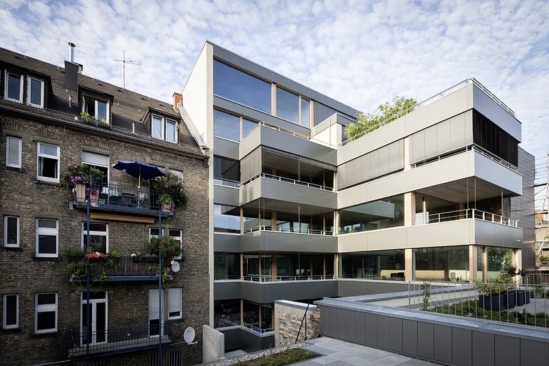 Die Straßenfassade aus eloxierten Aluminiumprofilen stellt in ihrer flimmernden gold-monochromen Farbigkeit einen bewussten Dialog zum charakteristischen Rindenmuster der Platanen im Straßenraum her. Mit ihren flächenbündig, frei komponierten und in ihrer Größe auf die dahinterliegenden Nutzungen reagierenden Fenstern formuliert sie einen klaren Kontrapunkt zur strengen Ordnung der gründerzeitlichen Fassadentektonik in der Nachbarschaft. Der expressiven Straßenfassade steht eine durch horizontale Brüstungsbänder klar gegliederte Südseite mit großzügigen, begrünten Balkonen und Terrassenflächen mit hoher Aufenthaltsqualität gegenüber. Hier konnte mittlerweile ein Bienenvolk angesiedelt werden, das in absehbarer Zeit hauseigenen Honig produzieren wird.