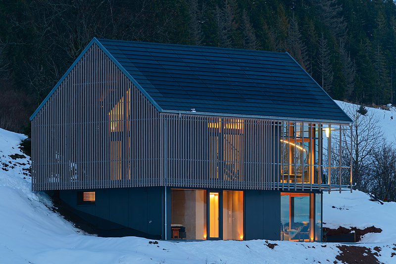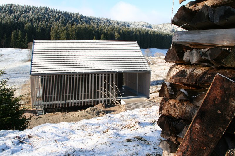 Atmosphäre durch die zweite Schicht und den umlaufenden Umgang um das Haus entstehen vielfältige Blickbeziehungen ins Tal oder in den scheunenartigen halboffenen Leerraum, der auch als Stellplatz genutzt und durch einen Schiebevorhang aus Weisstannestäben geschlossen werden kann. Das Haus ist dem herben Wetter auf über 1000 Meter Höhe stark ausgesetzt und bietet dagegen eine schützende Hülle.