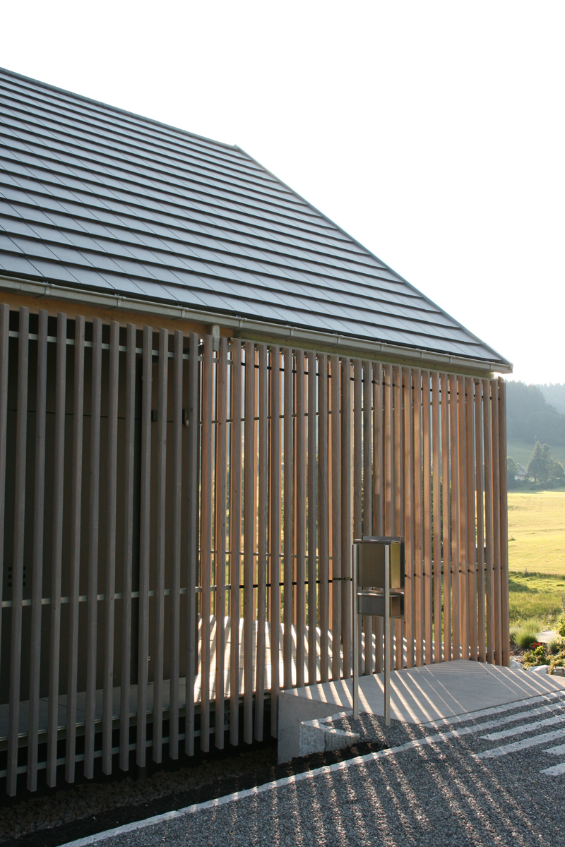 Materialität aussen die äußere Fassadenschicht zur Straße, zu den Nachbarn und zur Landschaft wurde mit Weisstannestäben auf Abstand verkleidet, um den Baukörper in die Landschaft mit ihren herben Holzbauten zu integrieren. Die innere Schicht hinter dem Umgang wurde mit anthrazitfarbenen Faserzementplatten bekleidet, um seine Eigenständigkeit und den Kontrast zu verstärken.