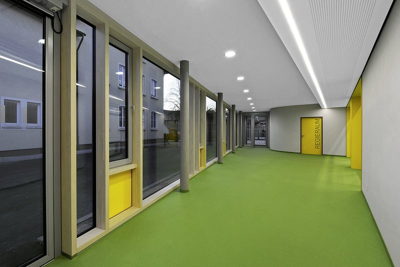 Der Zugang zur Schulsporthalle erfolgt barrierefrei vom Schulhof aus. Das Gebäude wird zum Pausenhof nach Süden bewusst großzügig verglast, um Einblicke in die Halle zu ermöglichen. Nach Norden hin wurde das Gebäude mit einem hohen Anteil geschlossener Wandflächen geplant, um einmal die energetischen Energieverluste zu minimieren und zum anderen die störenden Einflüsse durch die angrenzende Bahntrasse zu beschränken.