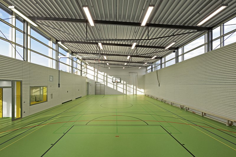 Die Schulsporthalle ist an das bestehende Nahwärmenetz der Gemeinde angeschlossen. Eine Photovoltaikanlage auf dem Dach der Halle liefert Strom für den Eigenbedarf und zur Einspeisung ins Netz.