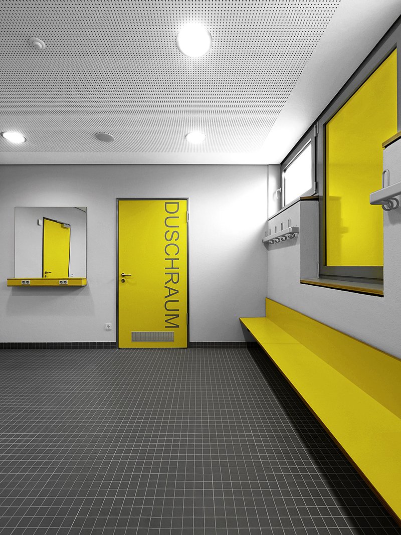 Das Eingangsfoyer bietet einen zentralen Zugang zu allen Hallenbereichen. Die Umkleiden befinden sich in der Nähe des Haupteinganges und sind direkt mit dem jeweiligen Dusch- und WC-Bereich verbunden.
