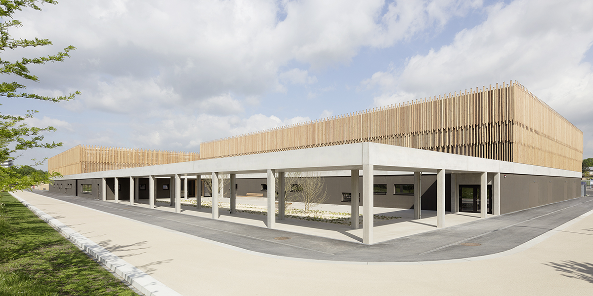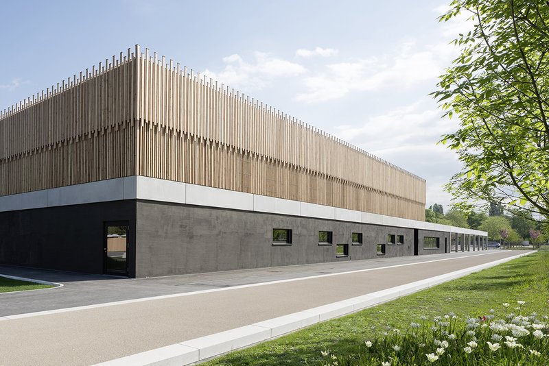 Die unteren Fassadenflächen symbolisieren Beton, durch unterschiedlich starke Bänder, die geologischen Verwerfungen. Oberhalb der Sockelplatte werden die Überhöhen der Hallenkörper mit einer Holzlamellenfassade unterschiedlich dicht verkleidet: Eine Art „abstrakter Wald“ aus Kanthölzern, symbolisch für die Randlage Lahrs am Schwarzwald.