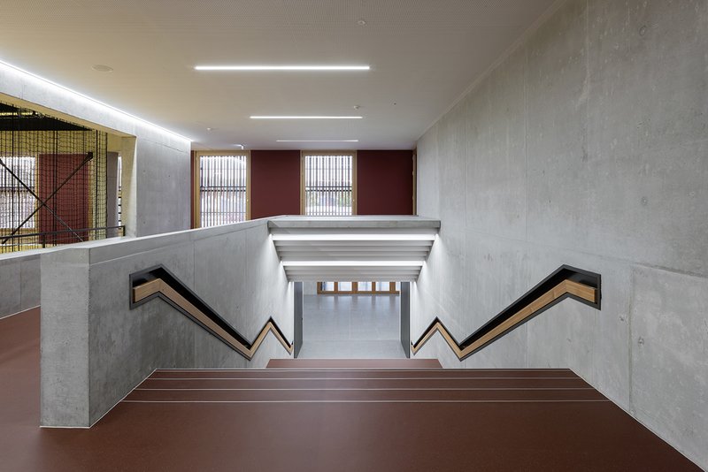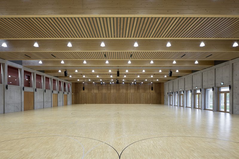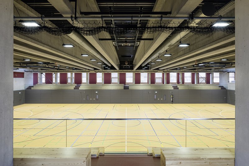 Beide Hallen werden durch eine Sockelplatte aus Betonfertigteilen zusammengehalten und als ein Ensemble erlebt. Auch die beiden Freibereiche, Eingangshof und Vereinshof werden in dieser Sockelplatte ausgespart und räumlich gefasst. Unterhalb dieser Sockelplatte befinden sich sämtliche Nutzungen mir geringer Raumhöhe.