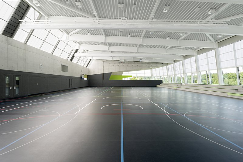 Die dreiteilbare Sporthalle mit Spielfeld 45 x 22 m gewährleistet durch ihre großzügig nach Norden geöffnete Fassade sowie dem nach Süden ausgerichteten Oberlicht und dem hohen Flächenanteil an Polycarbonat Mehrfachstegplatten eine optimale blendfreie Tagesbelichtung. Die direkt an das Sportfeld angrenzende dreireihige Zuschauertribüne entlang der Nordfassade der Halle stellt eine motivierende Nähe von Sportlern und Zuschauern her.