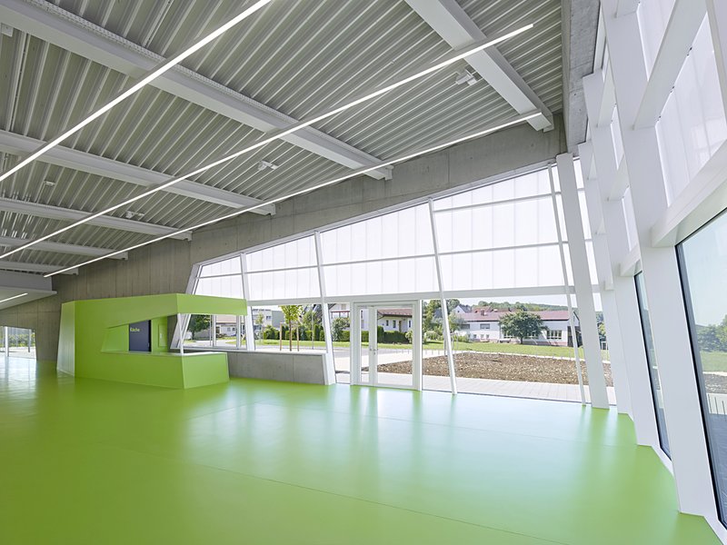 Die neue Sporthalle präsentiert sich als ausdrucksstarker und prägnanter Baukörper. Zwei unterschiedlich hohe Gebäudevolumen mit gegenläufigem Metall-Pultdächer, Halle und Funktionsbereich, werden geschickt durch das Foyer zu einer einheitlichen Gebäudeform zusammengefügt.
