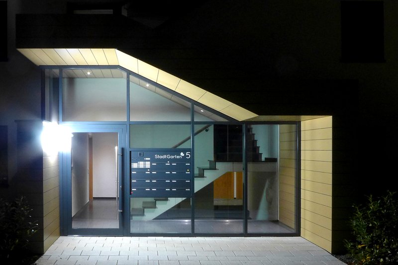 Auf dem Gelände der "Alten Ziegelei" galt es mit einer Neubebauung in direkter Nähe zum Stadtzentrum von Göppingen hohe Wohnqualität mit städtischer Dichte in Einklang zu bringen. Dem neuen Name "StadtGarten" war es geschuldet, den gesamten ruhenden Verkehr mit über 200 Stellplätzen unter die Erde zu bringen. Das geschah allerdings gut belichtet und belüftet durch groß dimensionierte Öffnungen aus denen Bäume herauswachsen. Neun Baukörper aus zwei Gebäudetypen sind im Wechsel städtebaulich so platziert und zueinander versetzt, dass sich die unterschiedlichsten Freiräume bilden. Die Wohnungsgrundrisse sind durch das gewählte statische System frei veränderbar - 103 m² als 2-, 3- oder 4-Zimmerwohnung zum Beispiel. Das Energiekonzept mit Blockheizkraftwerk ist vorbildlich - ein zum Projekt gehörendes Elektrofahrzeug wird davon auch noch "betankt".