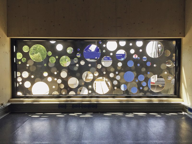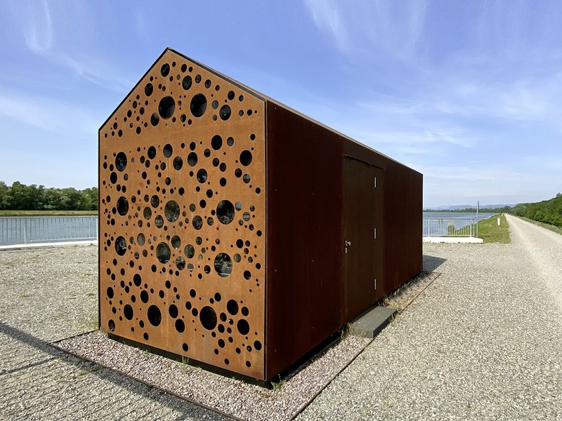 Die Anforderung an ein „natürlich“ wirkendes Material, das der exponierten Lage, aber auch der Gefahr von Vandalismus Stand halten kann, bestimmte die Wahl der Außenhaut. Die blasenförmigen Öffnungen an den Giebelfassaden symbolisieren die Funktion zur Steuerung des Einlaufbauwerks und bringen Tageslicht ins Innere und Ausblick zum Steuerstand.