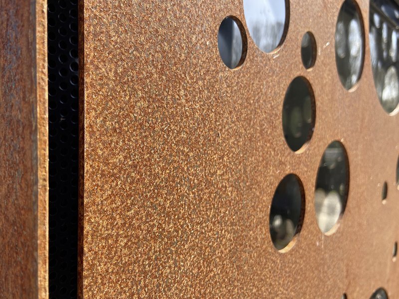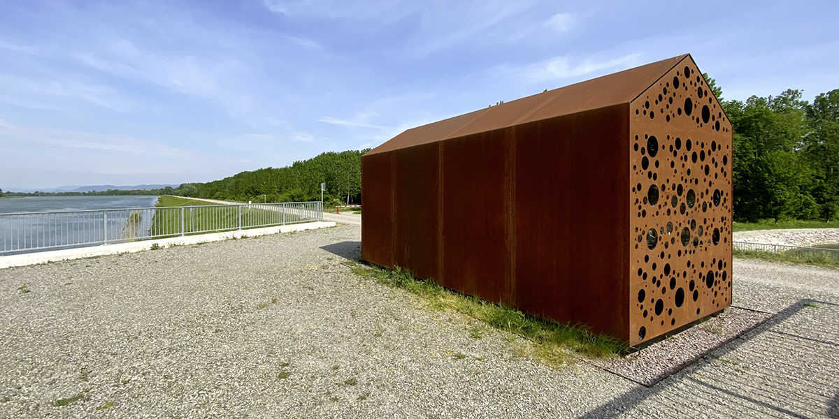 Die stoffliche Ausstrahlung des Materials wirkt naturnah und nicht „vordergründig“ farbig gestaltet. Die Stahlplatten changieren durch den stetigen Verwitterungsprozess in vielfältigen Farbnouancen von braun über orangebraun und braunviolett und harmonieren in ihrer vielschichtigen, erdigen Farbigkeit mit der Vielfarbigkeit der umgebenden Flächen des Rheindamms und des Rheinwaldes.