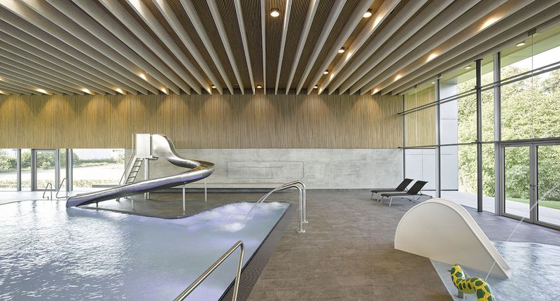 Die klare Grundriss-Organisation von Badehalle und Umkleidebereich ermöglichte eine kompakte und ökonomische Bauweise mit einem günstigen Fläche-Volumen-Verhältnis. So lassen sich nicht nur die Baukosten, sondern auch die Kosten im Betrieb reduzieren. Nach Westen, Norden und Osten bieten teils raumhohe Glasfassaden Ausblicke in die Umgebung. Dabei bilden die Auskragungen von Bodenplatte und Dachfläche im Westen die Eingangszone mit Freitreppe, im Osten den Übergang zum Freibereich mit Liegewiese. Um den Anteil der Glasfassaden zu reduzieren, wurde im Norden die obere Fassadenfläche geschlossen, so bleibt der Ausblick erhalten. Geringere Raumhöhen im Eingangsbereich und den Umkleiden reduzieren das Bauvolumen. Zudem entsteht durch die unterschiedlich hohen Baukörper ein Versatz am Schnittpunkt der Dachflächen, der die formale Strenge des Gebäudes auflöst und durch ein Oberlichtband den Innenraum zusätzlich mit Tageslicht versorgt.