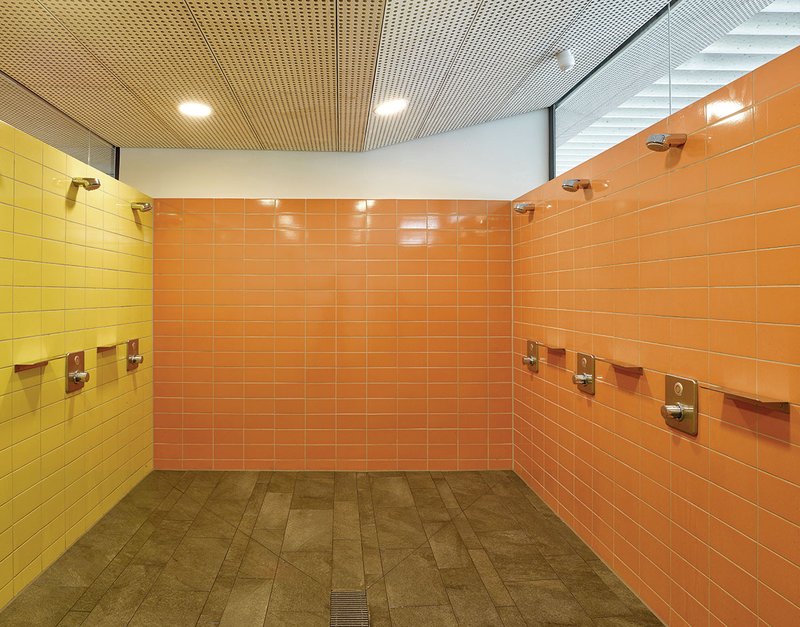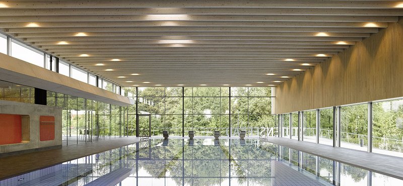 Die Materialien im Stutenseebad wurden entsprechend ihrer Leistungsfähigkeit eingesetzt: Während Keller- und Erdgeschoss in Stahlbeton (Sichtbeton) ausgeführt sind, konnte die Tragstruktur für die weit gespannte Badehalle und den Umkleidebereich in Holzbauweise errichtet werden. Auch die abgehängten, akustisch wirksamen Lamellen-Decken und Wandverkleidungen sowie die gelochte Seekieferdecke im Umkleidetrakt sind in Holz ausgeführt. Der Baustoff überzeugte Bauherr und Architekt aufgrund seiner zahlreichen positiven Eigenschaften und seiner natürlichen Anmutung: Holz bietet ein gesundes Raumklima, ist CO2-neutral und recyclingfähig und eignet sich hervorragend, um Räumen mit schallharten Flächen, wie Badehallen, Atmosphäre zu verleihen und die Raumakustik zu optimieren. Darüber hinaus sorgte der hohe Vorfertigungsgrad der Holzelemente für eine wirtschaftliche Bauweise und kürzere Bauzeiten. So wurde die Holzrippendecke elementweise im Werk des Holzbauunternehmens Müller Blaustein vorgefertigt – inklusive Dachentwässerung, Beleuchtung, Ela-Anlage und abgehängter Lamellen-Decke aus heimischer Weißtanne. Diese Paneele zwischen den Holzrippen der Decke und an der Wand prägen maßgeblich die Innenraumwirkung des Stutenseebades. Dabei ist die Lamellenstruktur nicht nur gestalterisches Element, sondern optimiert zugleich die Raumakustik. Im Umkleide- und Eingangsbereich ist die tiefer liegende Holzrippendecke mit einer gelochten, weiß lasierten Akustikdecke aus Seekieferplatten verkleidet. Neben Holzdecke und Glasfassaden verleihen Sichtbeton, anthrazitfarbenes Feinsteinzeug, farbige Mosaikfliesen und farbig gestaltete Glasspinde dem Innenraum eine freundliche und warme Atmosphäre. Die ruhigen Materialien und frischen Farben sind bis ins Detail und fein aufeinander abgestimmt, so entsteht einerseits eine unverwechselbare und eigenständige Wirkung im Bad, die zugleich unaufgeregt natürlich anmutet. Damit punktet das Bad nicht nur unter ökologischen und ökonomischen Gesichtspunkten. Es überzeugt auch durch seine hohe Gestaltungsqualität unter soziokulturellem Blickwinkel – optimale Voraussetzungen also für den langfristigen Werterhalt des Gebäudes.