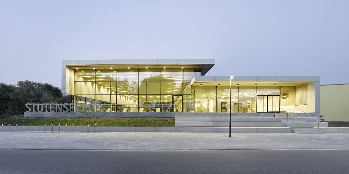 Schwimmen, rutschen, planschen oder auf der Liegewiese entspannen – das alles geht im Stutenseebad. Im Vordergrund der Planung für das neue Schwimmbad stand, ein gestalterisch überzeugendes und qualitativ hochwertiges Gebäude mit langer Lebensdauer zu errichten. So wurde der Neubau unter dem Blickwinkel der Nachhaltigkeitskriterien im staatlich geförderten kommunalen Hochbau (Förderprogramm NBBW) genau unter die Lupe genommen. Der kompakte Baukörper mutet von außen schlicht an, im Innenraum herrscht eine leuchtend helle Atmosphäre, die mit maximaler Aufenthaltsqualität überzeugt.