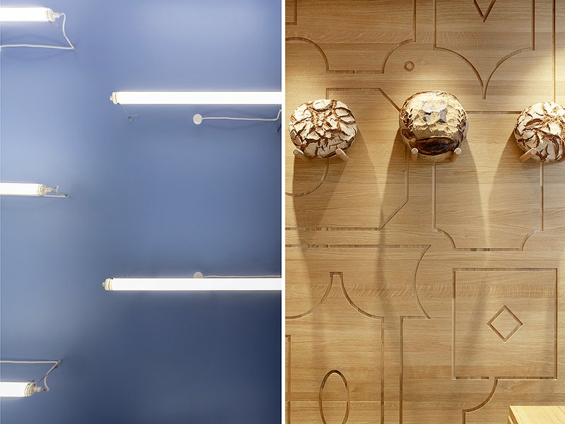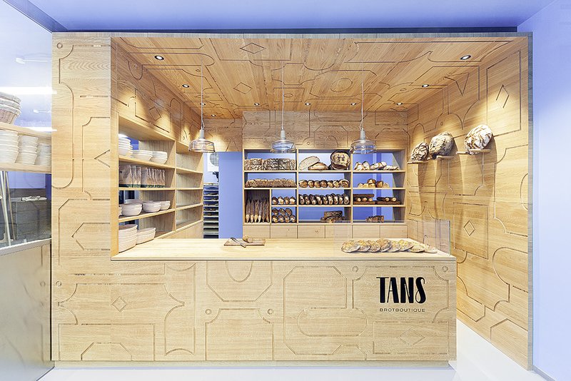 Die Muster im Eichenholz wurden in Anlehnung an klassische Kassettenverkleidungen mit aufgesetzten Zierleisten entwickelt und als Fräsungen in die Moderne übertragen. Sie bilden eine Reminiszenz an die Ornamentik der Gründerzeit und werden gleichzeitig zeitgenössisch interpretiert. Das Muster als Symbol für die Kunst des Backens, die schon in Vergessenheit geraten war, aber heute wieder mehr denn je gefragt ist.