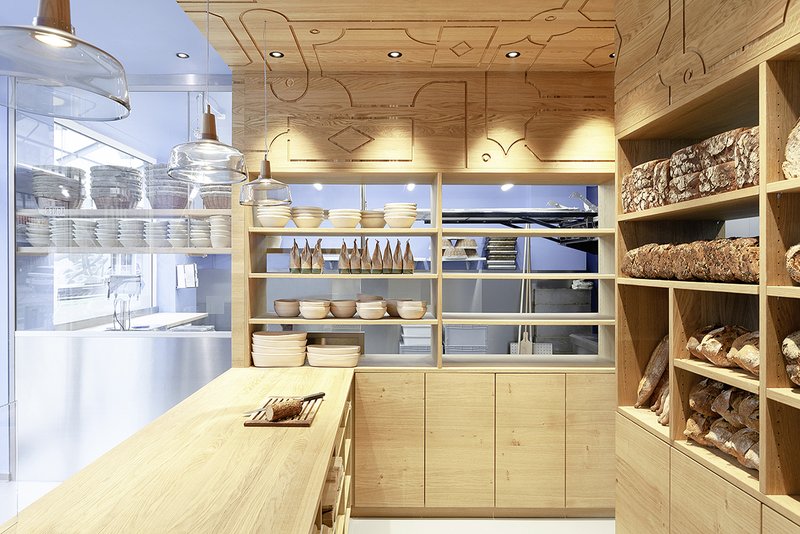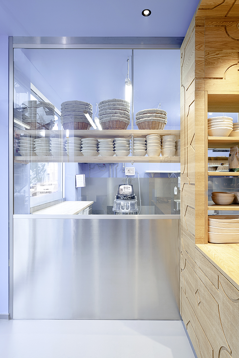 Die Umsetzung entwickelte sich aus dem Raum-im-Raum-Prinzip. Die Kundschaft betritt die in eisblau und Edelstahl ausformulierte Hülle der gläsernen Bäckerei, in die sich der Kern als Holz-Kubus aus Eichenholz legt. Direkt aus dem Backofen können die Brote in die offenen Regale geschoben werden. Eine große Glasscheibe trennt aus hygienischen Gründen den Kunden vom Arbeitsbereich, lässt jedoch Einblicke zu, die dem Kunden das Gefühl geben, in der Backstube zu stehen und dem Bäcker beim Backen zuzuschauen.
