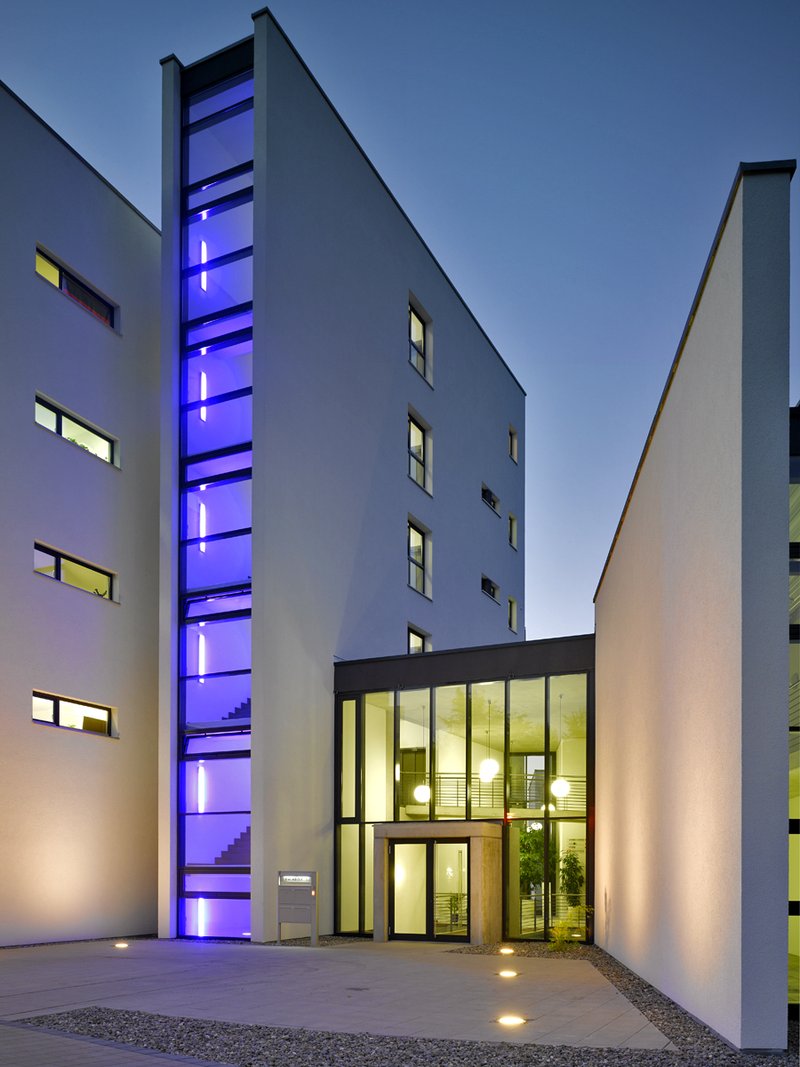 Der Solitär ist schlicht und zeitlos gestaltet. Durch die Wahl der Fassade (Loch-Putz-Fassade mit Sonnenschutz) und der Raumkonfiguration (1-Spangenbüro)sollen langfristige Nutzungskosten (Reinigung, Wärme/Kühlbedarf) möglichst gering gehalten werden.
