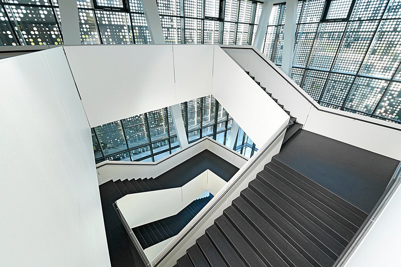 Die Fassadenhülle transformiert die Hauptnutzungen nach außen. Die gewählte Materialität, einer das Gebäude umhüllenden metallischen Plattenstruktur unterschiedlicher Durchlässigkeit, ermöglicht differenzierte Belichtungssituationen. Fassadentextur, Transparenz und Dichte schaffen Schwerpunkte. Großzügige Öffnungen für den Präsentationsraum, den Seminarbereich und die Caféteria werden ablesbar. Die vorgelagerten, geschützten Außenbereiche erweitern die inneren Nutzungsfunktionen und schaffen Übergänge von innen nach außen. Die gewählte Konstruktionsart ermöglicht großflächige, stützenfreie Nutzungsebenen von hoher Flexibilität und Variabilität.