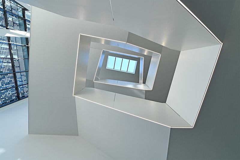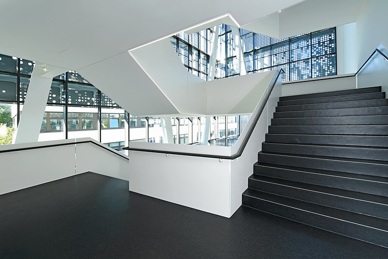 Das neue Technologiezentrum bildet den Abschluss einer internen Logistikachse der Walter AG. Im Übergang zum Grünraum Steinlachallee markiert der Solitär städtebaulich das Gegenüber zur Eingangssituation. Über eine Platzsituation betritt man das Eingangsfoyer, das durch eine eingestellte markante Treppenkonstruktion die unterschiedlichen Ebenen anbindet. Es entsteht ein Raum als Kommunikationszone mit Aus- und Einblicken.