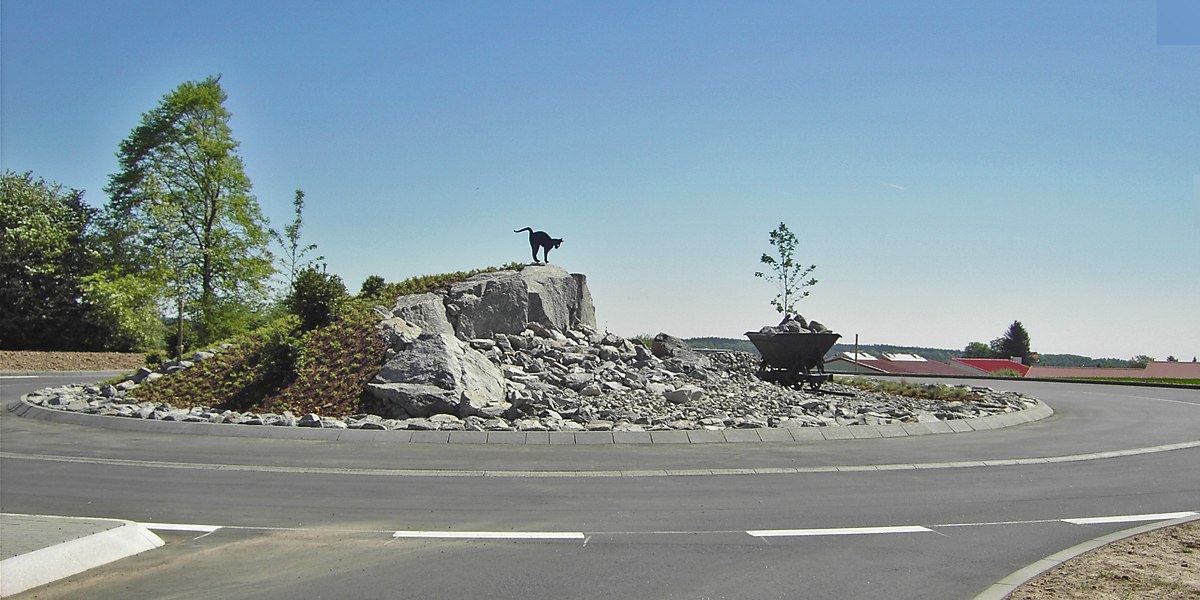 Im Innern des Kreisels wurde mit großen Basaltquadern und der entsprechenden Lore die damalige Situation dargestellt und angedeutet. Darüber erkennt man "eine Katze mit Buckel."