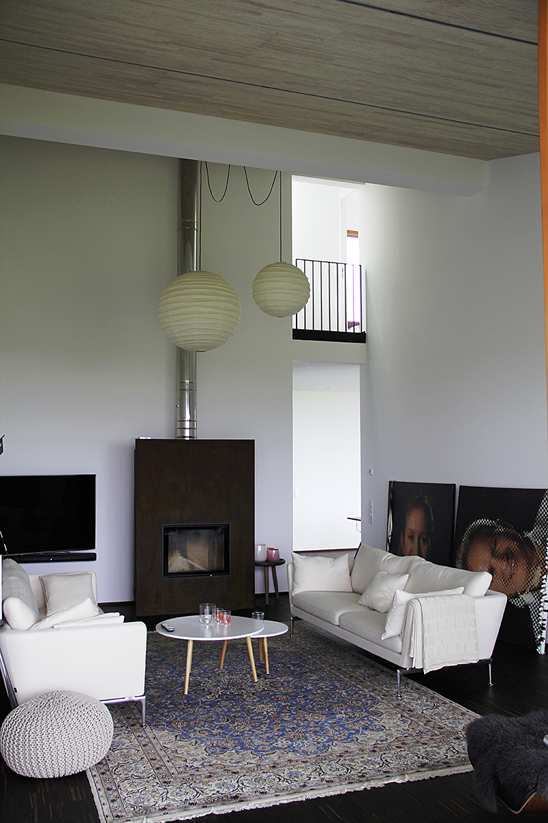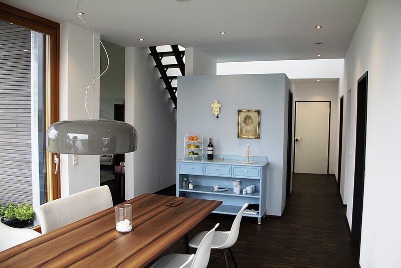 Die drei Wohnungen im Eingangsgeschoss sind als Maisonette-Wohnungen konzipiert, die Schlafräume sind zur Bergseite orientiert, die Wohnräume nach Süden. Die beiden Wohnungen im Gartengeschoss mit ihren vorgelagerten Terrassen komplettieren das Gebäude. Die großzügigen Verglasungen auf der Südseite erlauben den Blick in die freie Schwarzwaldlandschaft und ermöglichen, bei entsprechender Witterung, eine herrliche Aussicht bis in die Schweizer Alpen.